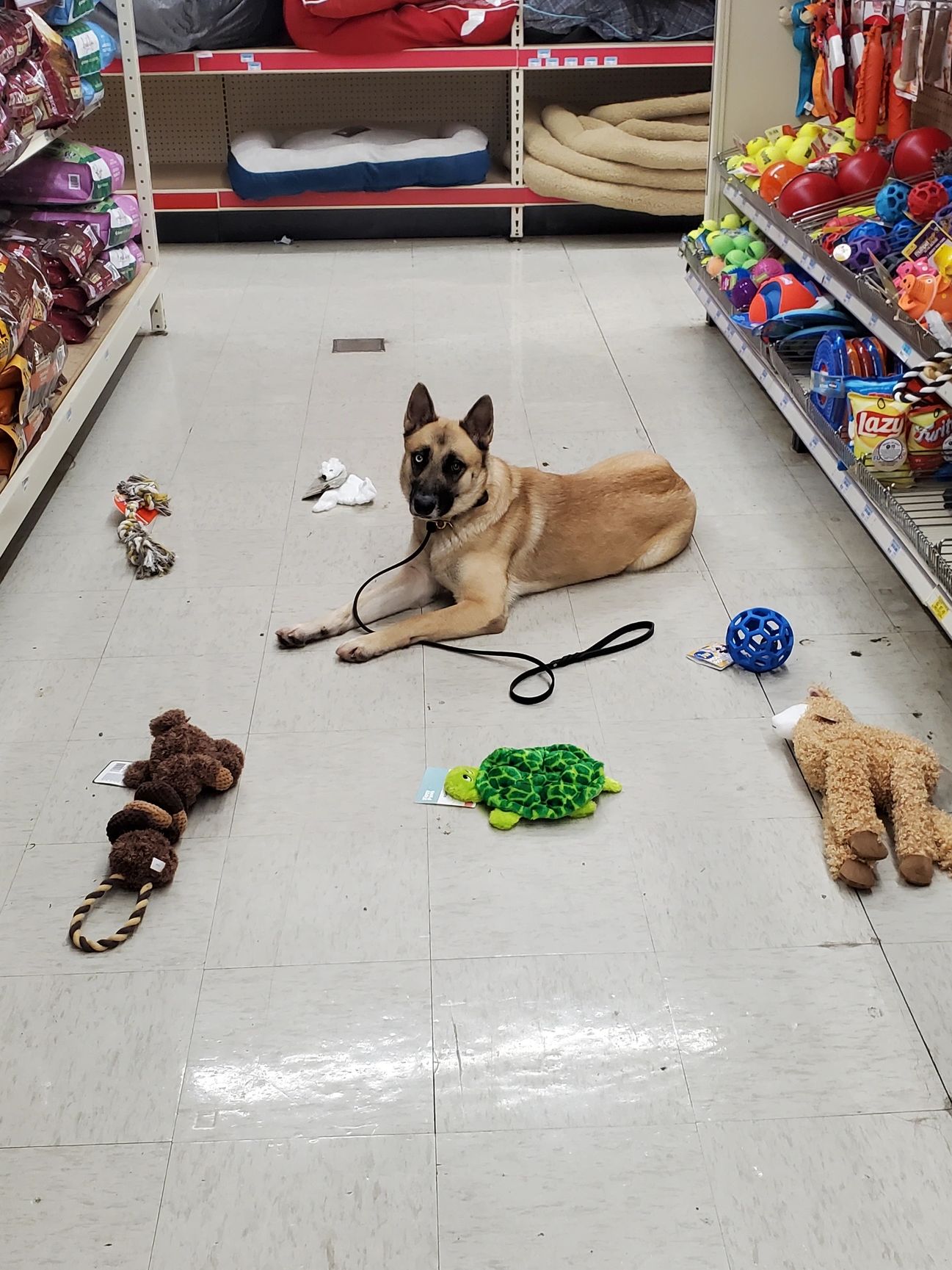 Nala showing off her down stay and leave it with many toy distractions and also being in a busy store.